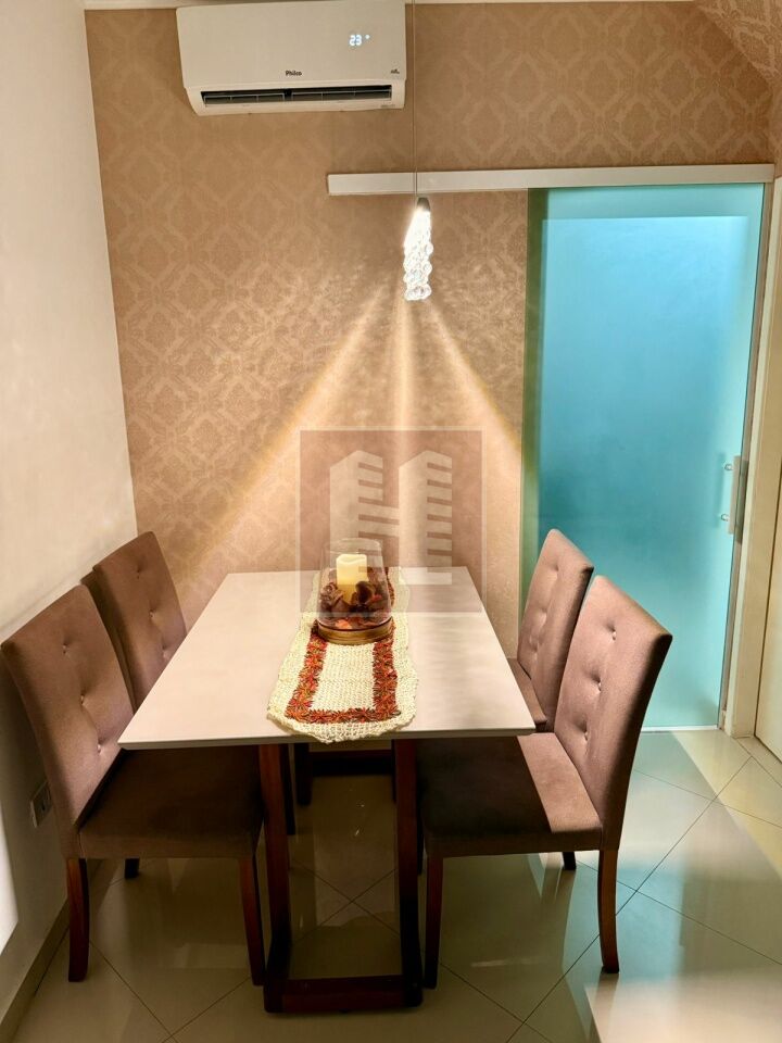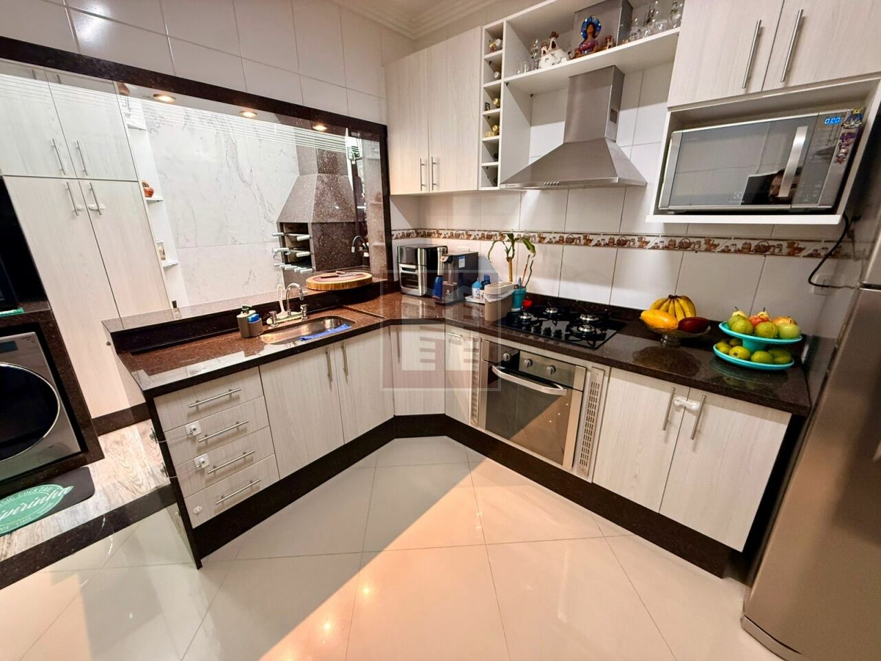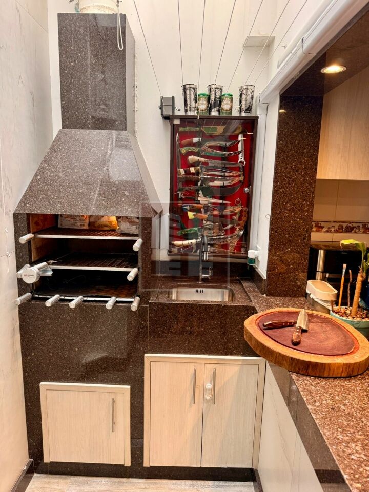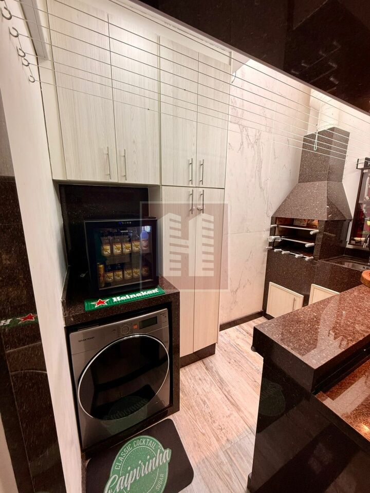 Compelto com armários, cozinha ampla integrada à area de seviço com churrasqueira.